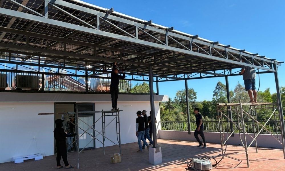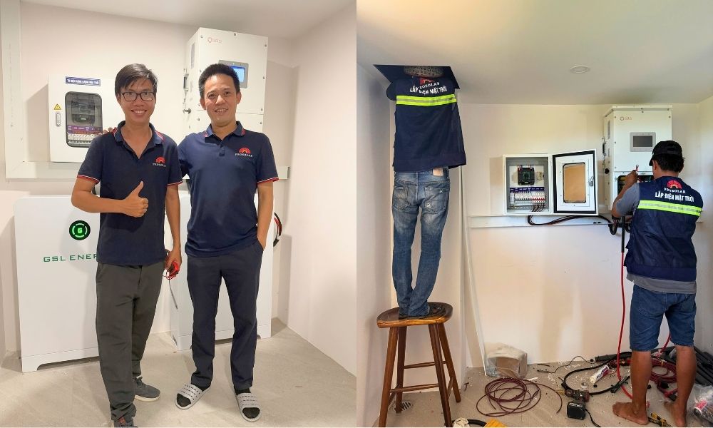 Khung giàn được cố định chắc chắn trên mái trước khi lắp đặt tấm pin nhằm đảm bảo an toàn trong điều kiện gió lớn và môi trường biển. Các tấm pin Canadian Solar được lắp đúng góc nghiêng và hướng nắng để tăng hiệu quả thu điện. Inverter Hybrid Solis và pin lưu trữ GSL được bố trí tại khu vực khô thoáng, thuận tiện cho việc vận hành và bảo trì. Hệ thống dây dẫn được đi gọn gàng, kiểm soát chặt chẽ các điểm đấu nối.