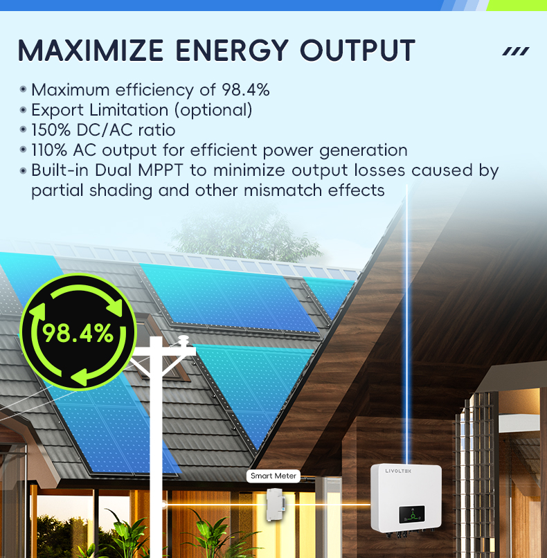 Biến tần bám tải inverter grid-tied 1 pha livoltek gt1-5kd1r11001 được thiết kế theo tiêu chuẩn kỹ thuật EU – R110 có hiệu suất chuyển đổi tối đa lên đến 98,4%, giúp tối ưu hóa sản lượng điện và giảm chi phí sử dụng điện lưới.