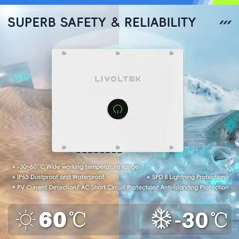 Biến tần bám tải inverter grid-tied 3 pha livoltek gt3-40kq1r11001 có dòng điện đầu vào tối đa của mỗi MPPT là 40A, tương thích với các mô-đun quang điện 600W+ trên thị trường toàn cầu