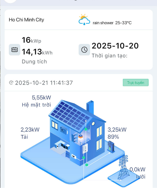 • Thiết bị: Pin mặt trời hiệu suất cao, biến tần Hybrid thế hệ mới và bộ lưu trữ Lithium (thường là 5kWh hoặc 10kWh).