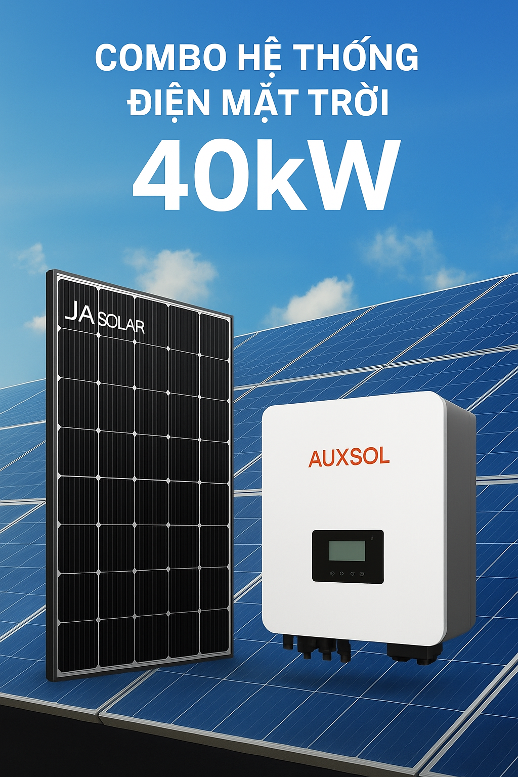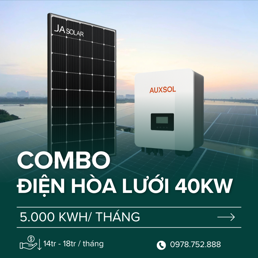 Combo điện mặt trời 40kW – Giải pháp tiết kiệm cho hộ tiêu thụ điện từ 14–18 triệu/tháng. Phù hợp mái nhà từ 211m², dùng điện 1 pha hoặc 3 pha. Hoàn vốn chỉ sau 1.5 - 2 năm, hệ thống bền bỉ đến 30 năm.